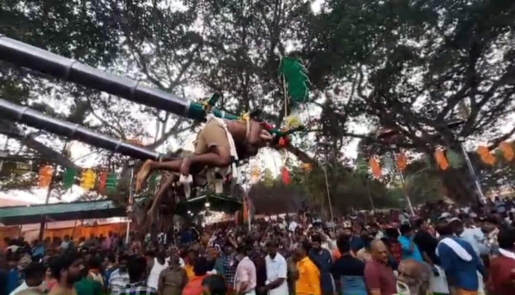 சுமார் 40அடி உயரம் கொண்ட இரண்டு வில்கள் வண்டியில் பொருத்தபட்டு ஒவ்வொரு வில்லிலும் இரண்டு தூக்ககாரர்கள் என 4பேர் இந்த வில்லுடன் பிணைக்கபட்டு அவர்களின் கைகளில் நேர்ச்சை குழந்தைகள் வழக்கபட்டு இந்த தேரை பக்தர்கள் சரண கோஷத்துடன் ஆலயத்தை ஒருசுற்று சுற்றி வருவது தூக்கநேர்ச்சை தூக்கத்திருவிழாவாகும்.