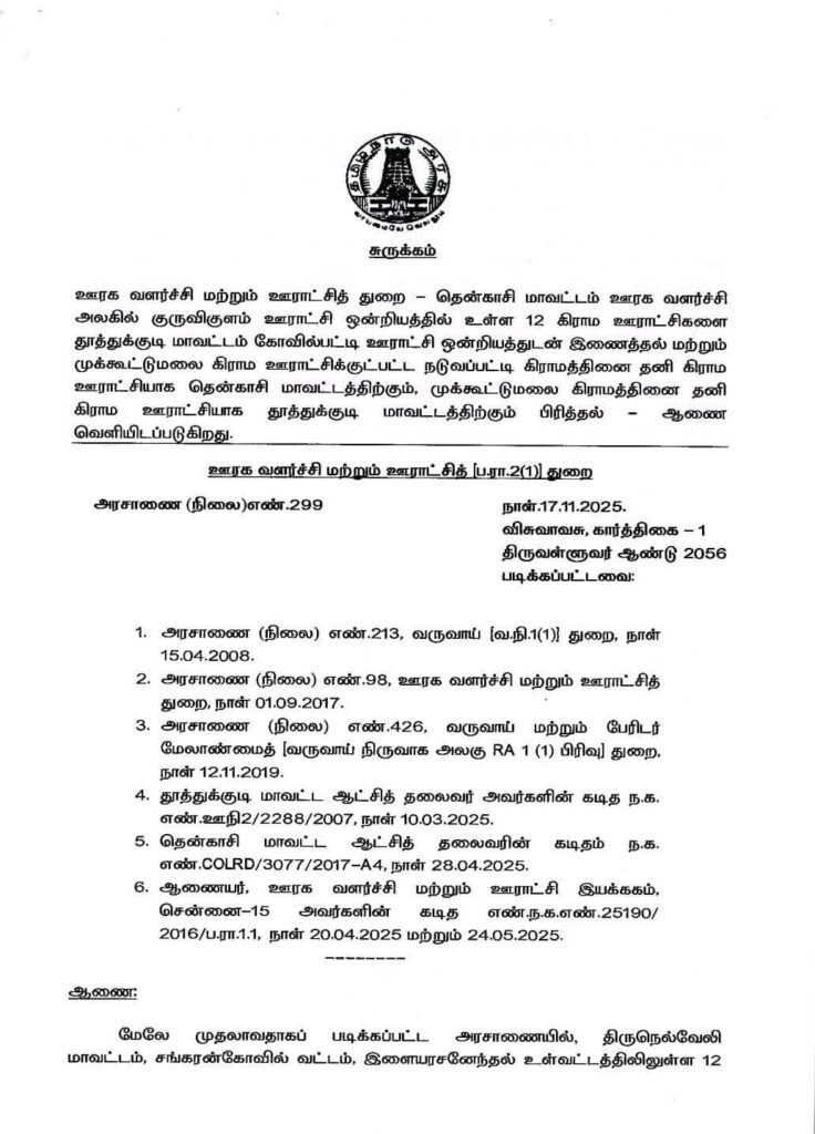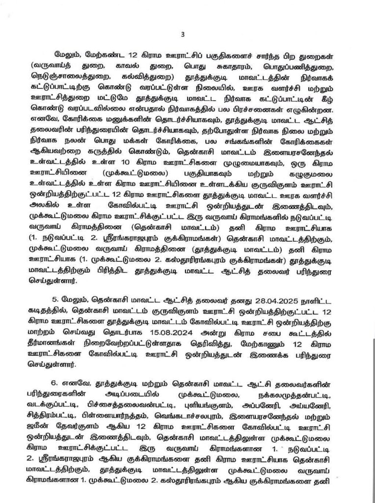 தென்காசி மாவட்டம் குருவிகுளம் ஒன்றியத்தில் உள்ள இளையரசனேந்தல் குறுவட்டப் பகுதிக்குட்பட்ட 12 ஊராட்சிகளை தூத்துக்குடி மாவட்டத்தில் இணைக்க அரசாணை வெளியிடப்பட்டுள்ளது.