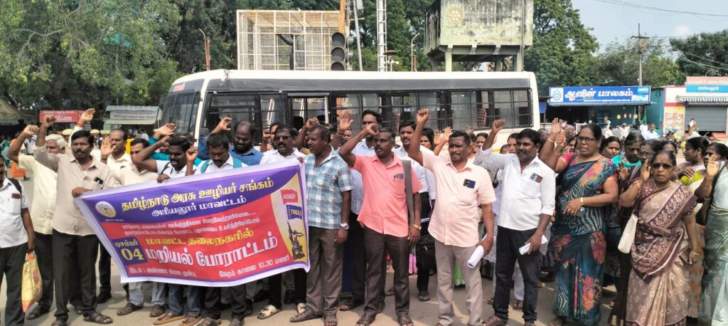 அம்ச கோரிக்கைகளை தமிழக அரசு உடனே வலியுறுத்தி, அரியலூர் பேருந்து நிலையத்தின் முன்பு சாலை மறியல் போராட்ட த்தில் ஈடுபட்ட தமிழ்நாடு அரசு ஊழியர் சங்கத்தினர், 147 பேர்ஐ போலீசார் கைது செய்தனர்.பழைய ஓய்வூதிய திட்டத்தை மீண்டும் அமல்படுத்த வேண்டும்.