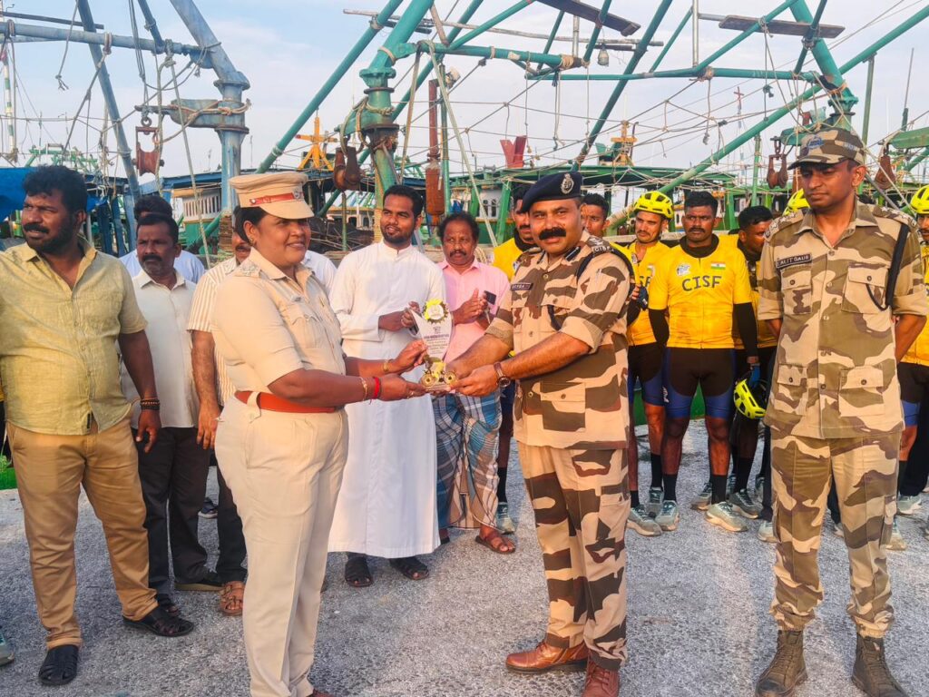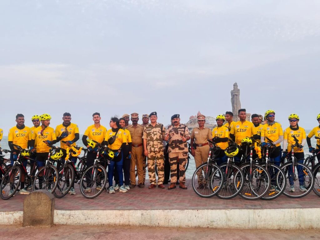இந்தியாவின் தென் எல்லையான கன்னியாகுமரியில் சைக்கிள்கள் பயண குழுவினர்களை. மத்திய தொழில் துறை பாதுகாப்பு படையின் கமாண்டர்