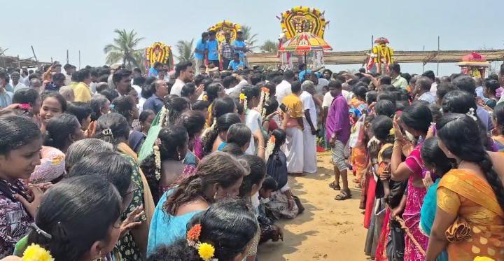 அதனைத் தொடர்ந்து தீர்த்தவாரி நடைபெற்றது. அப்போது சுவாமிகளை பக்தர்கள் சுமந்து அலைகளுக்கு இடையே சென்று சுற்றி வந்தனர். கடற்கரையில் குவிந்திருந்த பக்தர்கள் கடல் நீரை வாரி சுவாமியின் மேல் அடித்து ஆரவாரம் செய்தனர். அதனைத் தொடர்ந்து சுவாமிகளுக்கு மகா தீபாரணை நடைபெற்றது.