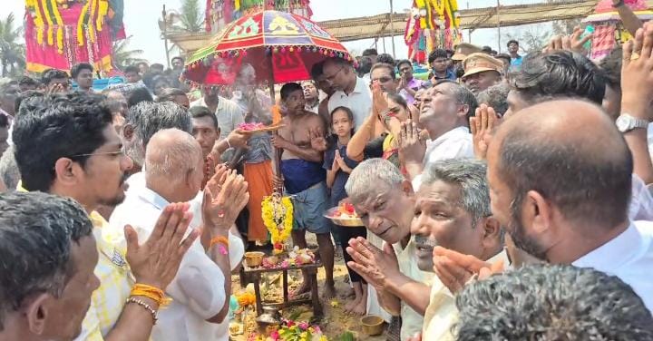 அதனைத் தொடர்ந்து தீர்த்தவாரி நடைபெற்றது. அப்போது சுவாமிகளை பக்தர்கள் சுமந்து அலைகளுக்கு இடையே சென்று சுற்றி வந்தனர். கடற்கரையில் குவிந்திருந்த பக்தர்கள் கடல் நீரை வாரி சுவாமியின் மேல் அடித்து ஆரவாரம் செய்தனர். அதனைத் தொடர்ந்து சுவாமிகளுக்கு மகா தீபாரணை நடைபெற்றது.