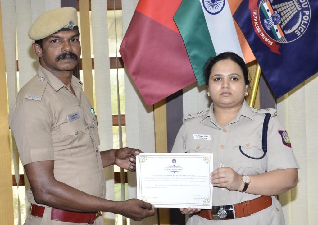 தற்போது மருத்துவமனையில் அவருக்கு சிகிச்சை கொடுக்கப்பட்டு வரும் நிலையில் தற்கொலைக்கு முயன்ற மூதாட்டியை துரிதமாக செயல்பட்டு காப்பாற்றி அவரை மருத்துவமனைக்கு அனுப்பி வைத்த காவலர்கள் ஹட்டிராஜ் மற்றும் பிரபாகரன் ஆகியோரை தேனி மாவட்ட காவல் கண்காணிப்பாளர் சினேகா மாவட்ட காவல் கண்காணிப்பாளர் அலுவலகத்திற்கு வரவழைத்து அவர்களை பாராட்டி தனது வாழ்த்துக்களை தெரிவித்து சான்றிதழ்களை வழங்கினார்.