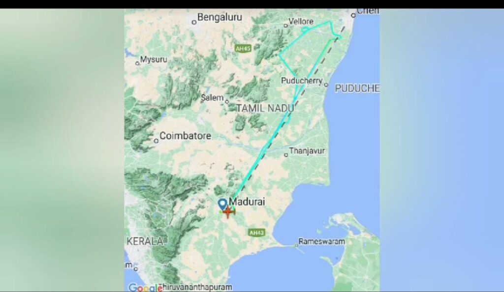 காலை ஏழு 40 மணியளவில் சென்னையிலிருந்து மதுரை வந்த இண்டிகோ விமானம் மதுரையில் இருந்து காலை 8 10 மணிக்கு புறப்பட்டு சென்னை சென்றது. சென்னையில் பெங்கல் புயல் காரணமாக ஏற்பட்ட வானிலை மாற்றத்தால் தரையிறங்க முடியாமல் சென்னையில் இருந்து மீண்டும் மதுரை வந்தடைந்தது.