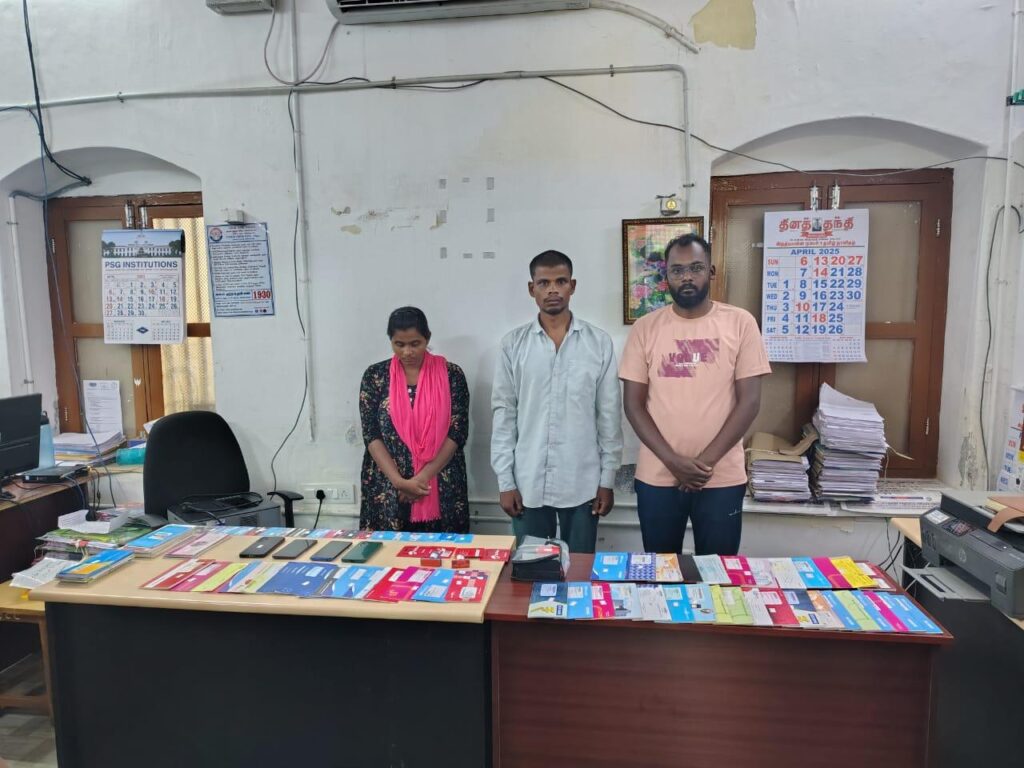 இதில் நித்தியா தனியார் வங்கியில் உதவி மேலாளராக வேலை செய்து வருகிறார். இந்த மூன்று பேரும் சேர்ந்து ஒரு நிறுவனம் நடத்துவது போல், ஜோஜூ மேத்யூ இடம் பேசி ரூபாய் 50 லட்சம் மோசடி செய்தது தெரியவந்தது. உடனே காவல் துறையினர் அந்த மூன்று பேரை கைது செய்தனர். அவர்களிடம் இருந்து 5 செல்போன்கள், ஒன்பது சிம் கார்டுகள், 25 ஏ.டி.எம் கார்டுகள், 23 வங்கி கணக்கு புத்தகம், 62 காசோலை புத்தகம் உள்ளிட்ட 129 பொருட்கள் பறிமுதல் செய்யப்பட்டன. பின்னர் மூன்று பேரையும் நீதிமன்றத்தில் ஆஜர்ப்படுத்தி கோவை மத்திய சிறையில் அடைத்தனர்.