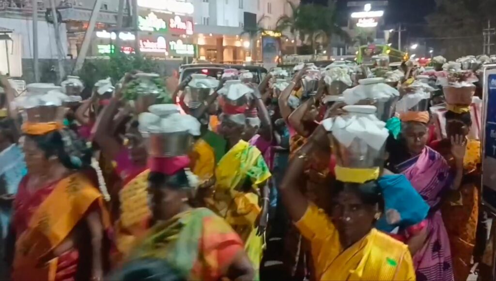 பழனி மலை அடிவாரத்தில் இருந்து 500 க்கும் மேற்பட்ட பெண்கள் பால்குடம் எடுத்து ஊர்வலமாக மாரியம்மன் கோவிலுக்கு சென்றனர்.