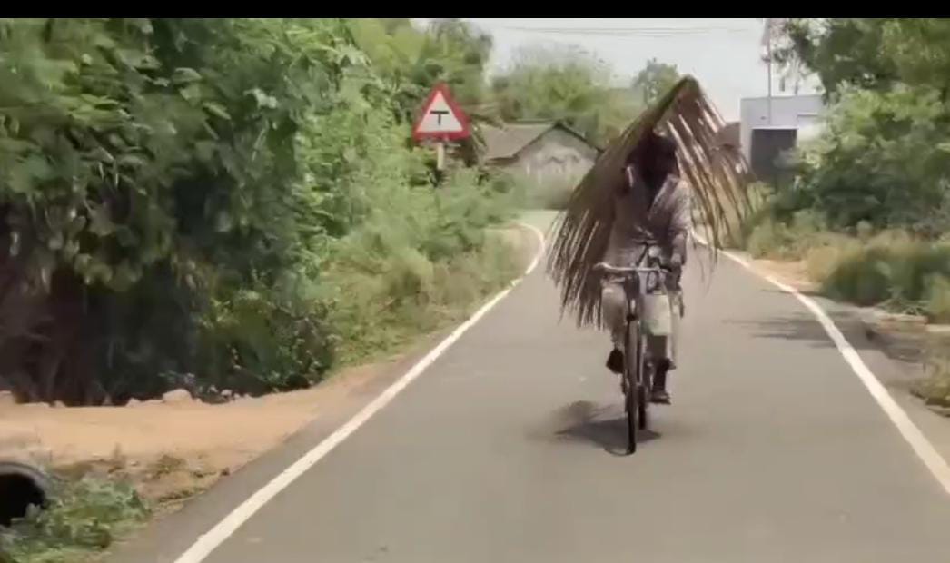இவர் கோடை வெயிலின் தாக்கத்தை சமாளிக்க சைக்கிளில் செல்லும்போ,து தென்னை ஓலையுடன் சென்று விட்டு வேலை முடிந்ததும் கோடை வெயிலின் தாக்கத்தை சமாளிக்க, தலையில் தென்னை ஓலையை சுமந்தவாறு ஒரு கையில் தென்னை ஓலையையும், மற்றொரு கையில் சைக்கிளையும் பிடித்தவாறு வீட்டிற்கு செல்கிறார்.