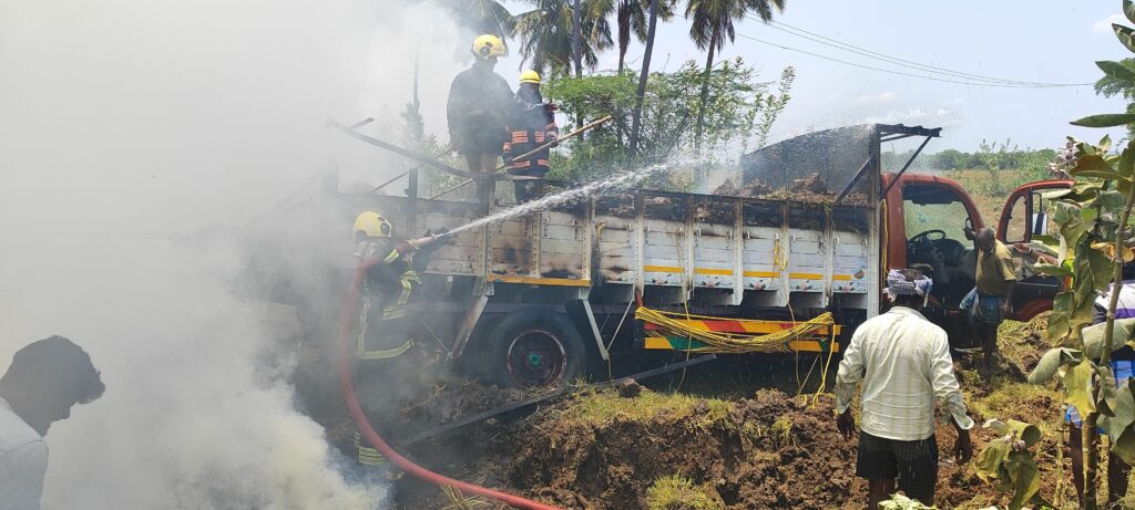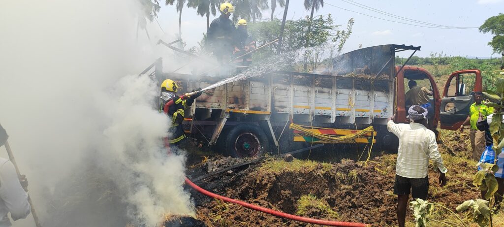 அப்போது அங்குள்ள அய்யனார் கோயில் முன்பாக திடீரென்று எதிர்பாராத விதமாக மின்சார கம்பி உரசியதில் வைக்கோல் கட்டில் தீப்பிடிக்க தொடங்கியது அதைக் கண்ட ஜெயராஜ் என்ன செய்வது என்று தெரியாமல் பதட்டத்தில் லாரி வேகமாக ஓட்டி வந்த போது லாரியில் இருந்த வைக்கோல் கட்டுக்கள் சிதறி விழுந்ததில் வயல்வெளியில் காய்ந்திருந்த தாள்களில் தீபிடித்து மளமள என்று எரியத் தொடங்கியது.