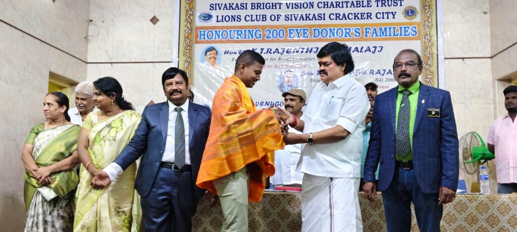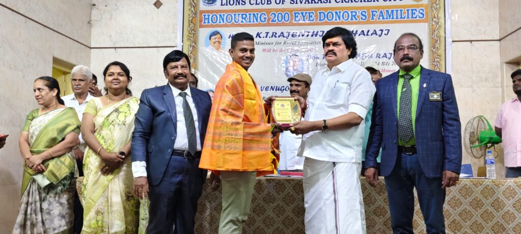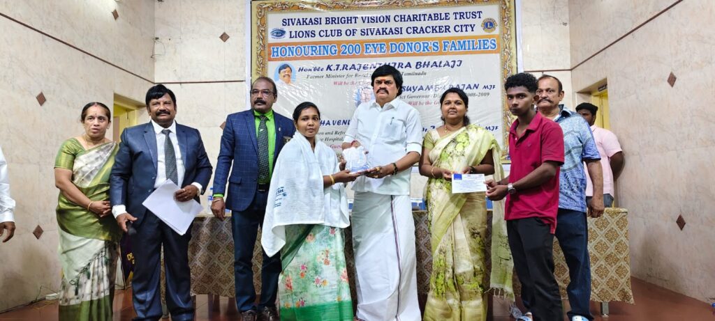 விருதுநகர் மாவட்டம் சிவகாசியில் சிவகாசி பட்டாசு நகர் அரிமா சங்கம் சார்பாக கண் தானம் செய்த 200 குடும்பங்களை கௌரவிக்கும் விழா நடைபெற்றது.