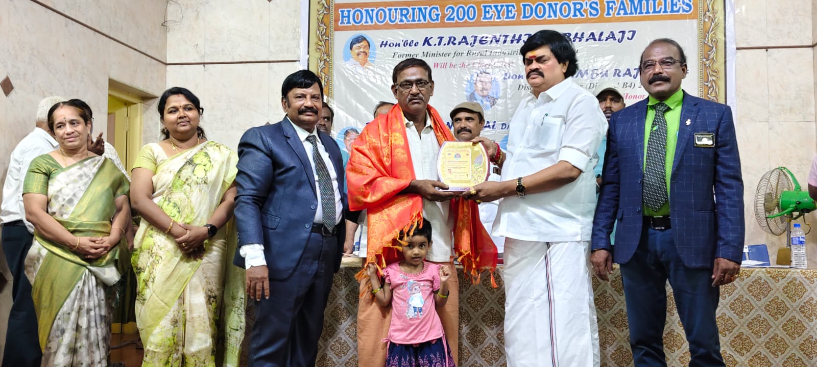 நிகழ்சிக்கு கண்தான உலக சாதனையாளர் அரிமா.டாக்டர்.ஜே. கணேஷ் தலைமை வகித்தார். சிறப்பு அழைப்பாளராக முன்னாள் அமைச்சர் கே.டி.இராஜேந்திரபாலாஜி கலந்து கொண்டு கண் தானம் செய்த 200 குடும்பங்களுக்கும் உடல் தானம் செய்த 4 குடும்பங்களுக்கும் சால்வை அணிவித்து கேடயம், சான்றிதழ் வழங்கி பாராட்டி பேசியது