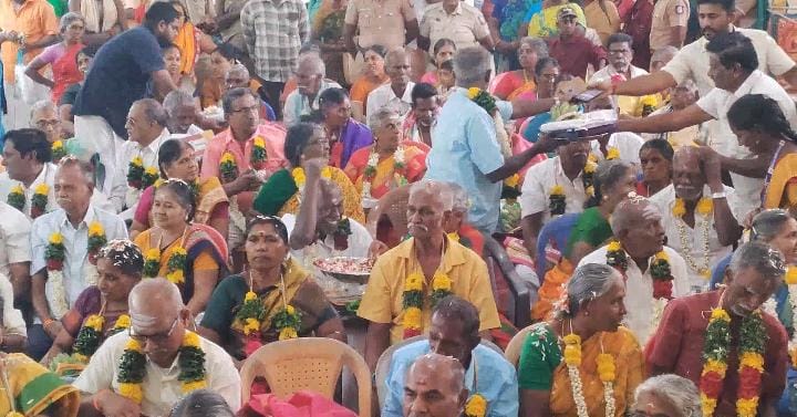 70 வயது நிரம்பிய 30 மூத்த தம்பதியினர்கள் அழைத்து அவர்களுக்கு கோவில் கொழுமண்டபத்தில் வேஷ்டி சட்டை சேலை அடங்கிய மங்களப் பொருட்கள் வழங்கிய அவர்களுக்கு மாலை அணிவித்து மரியாதை செலுத்தப்பட்டது.