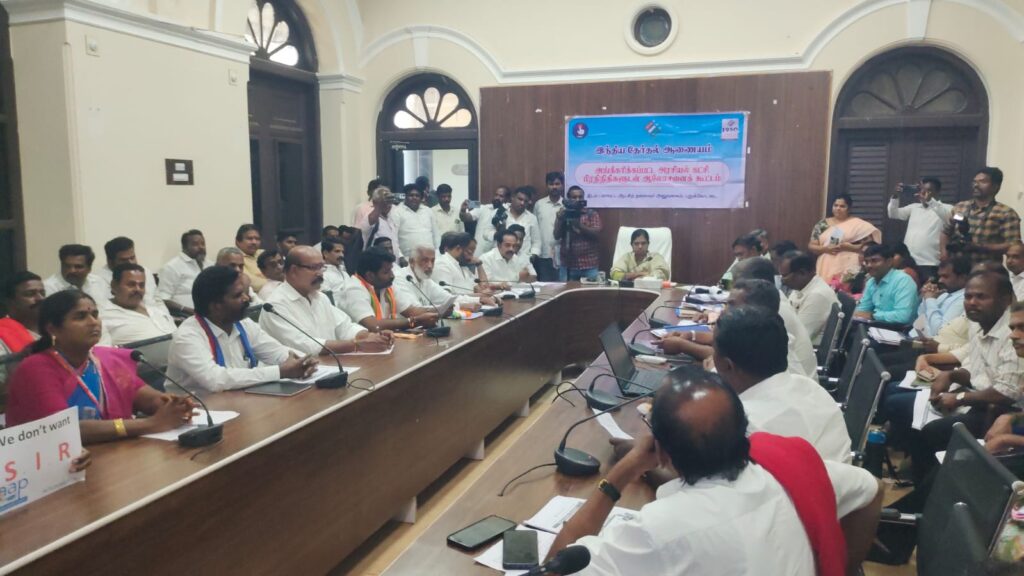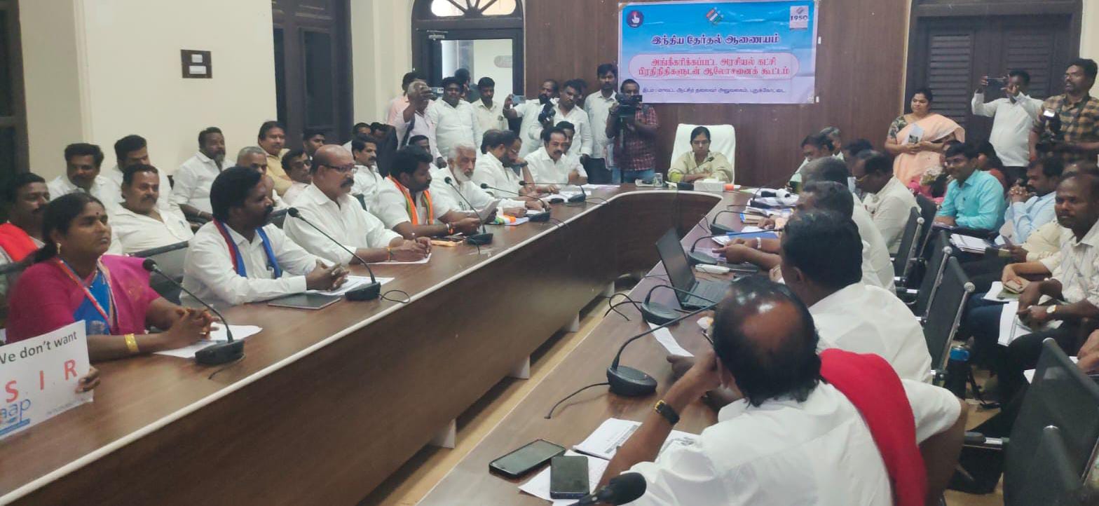 இதில் திமுக காங்கிரஸ் இந்தியா கூட்டணி பிரதிநிதிகள் எஸ் ஐ ஆர் வேண்டாம் என்ற பதாகைகளை கையில் ஏந்தி கலந்து கலந்துகொண்டு திமுக காங்கிரஸ் விடுதலை சிறுத்தைகள் இந்திய கம்யூனிஸ்ட் உள்ளிட்ட கட்சிகள் எஸ் ஐ ஆர் க்கு எதிர்ப்பு தெரிவித்தனர்