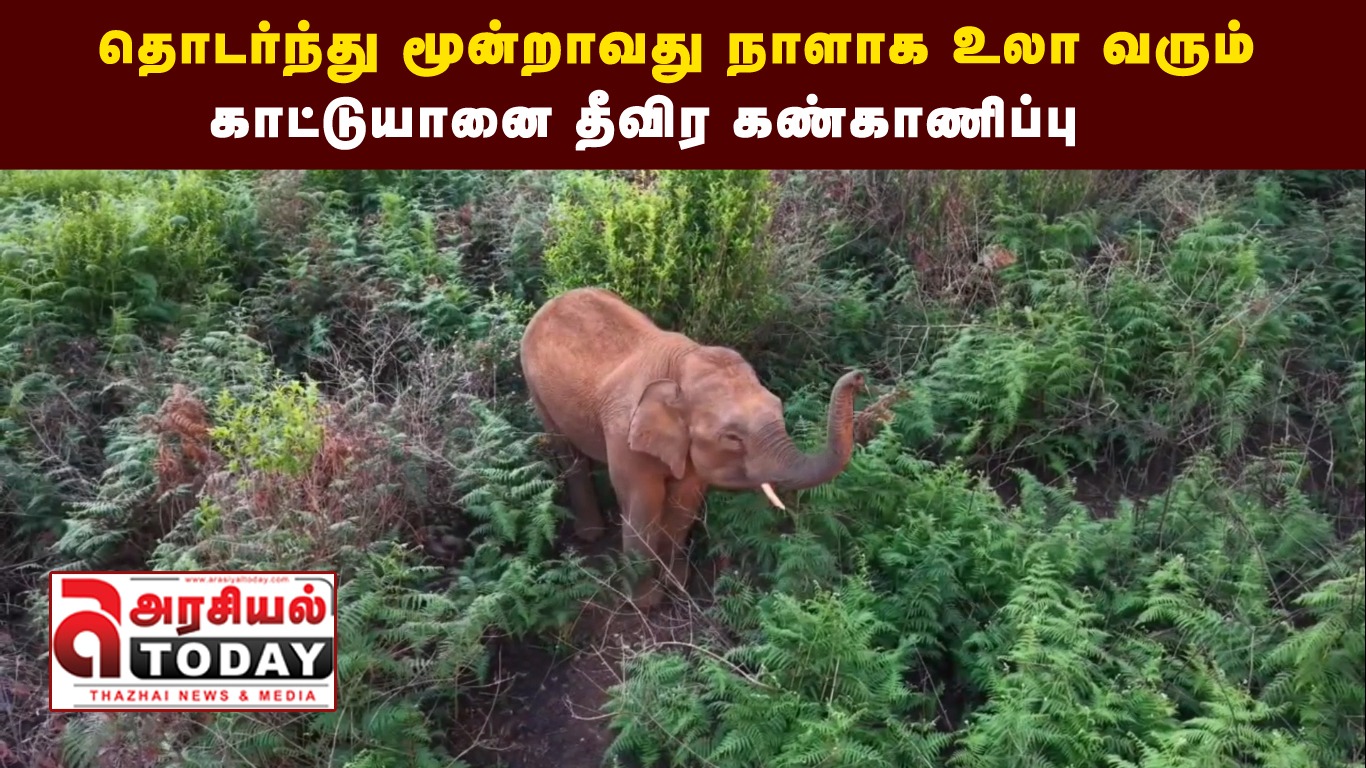 அடர்ந்த வனப்பகுதிக்குள் மறைந்திருக்கும் காட்டு யானையை ட்ரோன் கேமராவில் கண்டறிந்த வனத்துறையினர்  பட்டாசுகள் வெடித்து யானையை விரட்ட முயற்சித்து வருகின்றனர்.