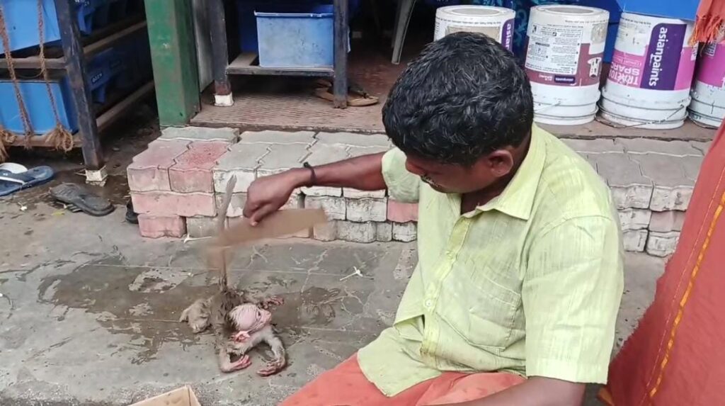 இதனை கண்ட அருகில் கடையில் வேலை பார்க்கும் தர்மராஜன் என்பவர் உடனடியாக குரங்கை மீட்டு அதற்கு முதலுதவி சிகிச்சைகள் (தண்ணீர் தெளித்தும் காற்று விசிறி விட்டு) குரங்கு பத்திரமாக உயிருடன் மீட்க போராடினார். இதைத் தொடர்ந்து சிறிது நேரத்திலேயே குரங்கு மீண்டும் அதன் இயல்பு நிலைக்கு வந்தது.