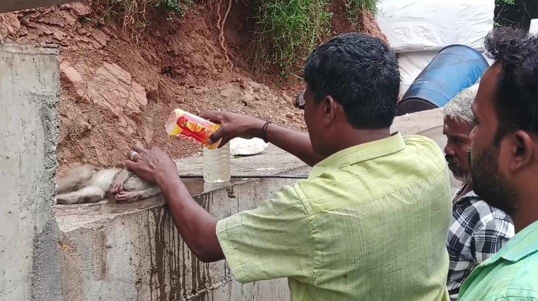 இதனை கண்ட அருகில் கடையில் வேலை பார்க்கும் தர்மராஜன் என்பவர் உடனடியாக குரங்கை மீட்டு அதற்கு முதலுதவி சிகிச்சைகள் (தண்ணீர் தெளித்தும் காற்று விசிறி விட்டு) குரங்கு பத்திரமாக உயிருடன் மீட்க போராடினார். இதைத் தொடர்ந்து சிறிது நேரத்திலேயே குரங்கு மீண்டும் அதன் இயல்பு நிலைக்கு வந்தது.
