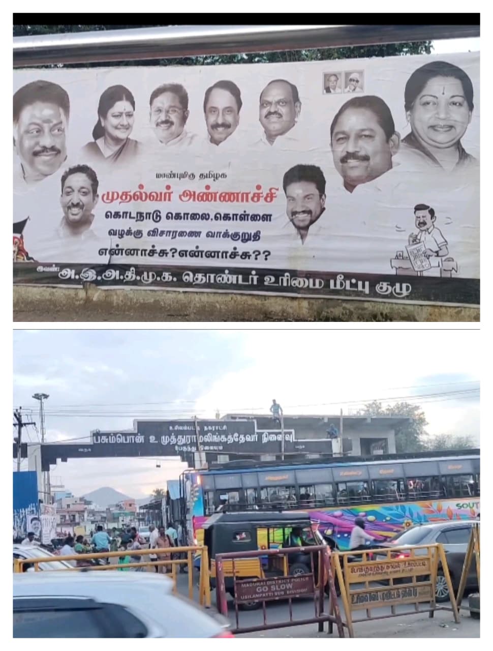 மதுரை மாவட்டம் உசிலம்பட்டி நகர் பகுதிகளான தேனி சாலை, மதுரை சாலை, வத்தலக்குண்டு சாலை,பேரையூர் சாலை மற்றும் உசிலம்பட்டியின் முக்கிய வீதிகள் முழுவதும் ஓபிஎஸ் ஆதரவு அதிமுக தொண்டர் உரிமை மீட்பு குழுவினர் சார்பில் அதிமுக முன்னாள் முதல்வர் எடப்பாடி பழனிச்சாமிக்கு எதிராக ஒட்டப்பட்ட போஸ்டரால் பரபரப்பு.,