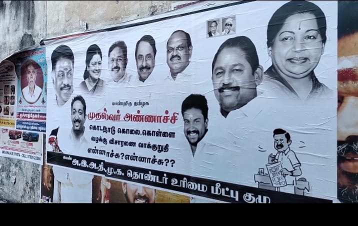 இதில் மாண்புமிகு தமிழக முதல்வர் அண்ணாச்சி கொடநாடு கொலை கொள்ளை வழக்கு விசாரணை வாக்குறுதி என்னாச்சு என்னாச்சு என போஸ்டர் ஒட்டப்பட்டுள்ளது.,