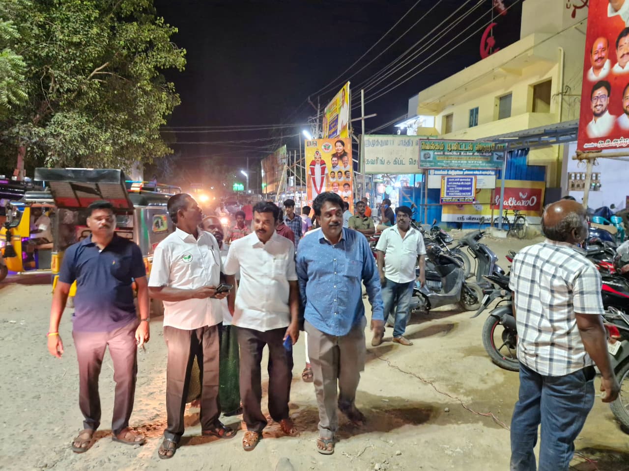 பொதுக்கூட்டம் நடைபெறப் போகும் இடத்தை வெம்பக்கோட்டை அதிமுக கிழக்கு ஒன்றிய செயலாளர் பல்க் முனிசாமி, சாத்தூர் கிழக்கு ஒன்றிய செயலாளர் சண்முககனி ராஜபாளையம் ஒன்றிய செயலாளர் மாரியப்பன் உள்பட அதிமுக நிர்வாகிகள் அருகில் உள்ளனர்.