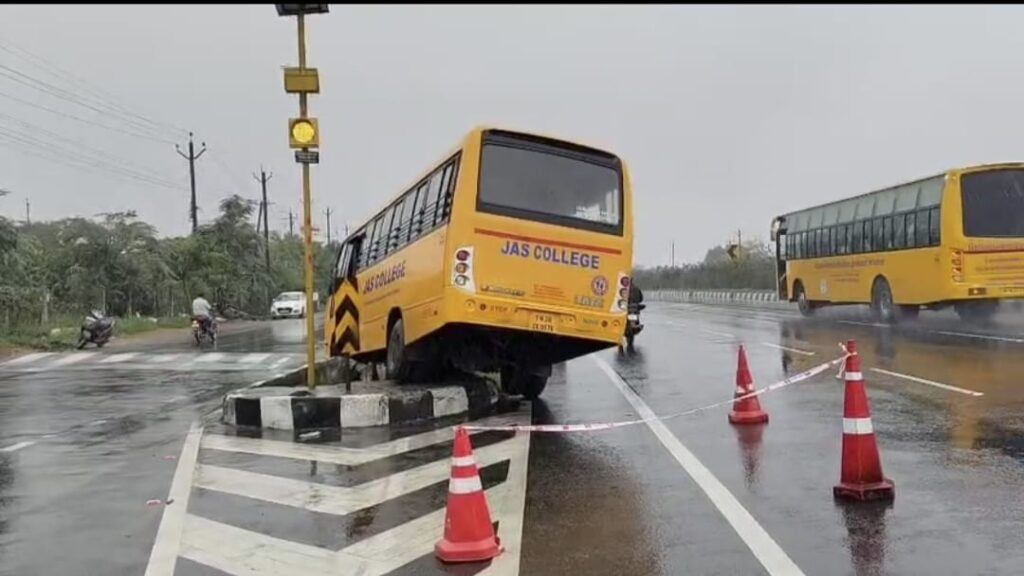 கோவை நகர் மற்றும் புறநகர் பகுதியில் இருந்து ஏராளமான குழந்தைகள், நாள்தோறும் பள்ளி வாகனங்கள் மூலம் வந்து செல்வது வழக்கம் இந்நிலையில் தீபாவளி பண்டிகை ஒட்டி நான்கு நாட்கள் விடுமுறைக்கு பிறகு பள்ளிகள் திறக்கப்பட்ட நிலையில் கோவை மாவட்டம் கருமத்தம்பட்டி அடுத்த எலச்சிபாளையம் பகுதியில் இருந்து சைதன்யா குழுமத்திற்கு சொந்தமான கல்லூரி வேனில் பள்ளி குழந்தைகளை அழைத்துக் கொண்டு ஓட்டுநர் மகேஸ்வரன் சேலம் கொச்சின் தேசிய நெடுஞ்சாலையில் வந்து கொண்டு இருந்தார்.