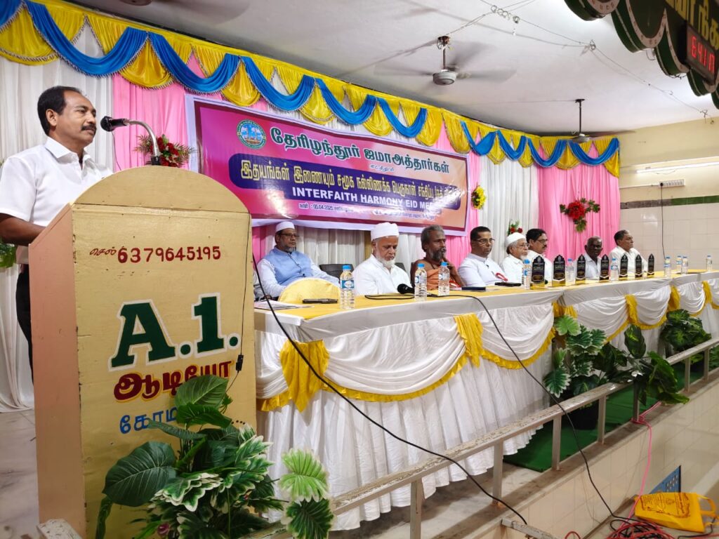 மயிலாடுதுறை மாவட்டம் மயிலாடுதுறை அடுத்த தேரிழந்தூர் கிராமத்தில் இஸ்லாமிய ஜமாத்தார்கள் சார்பில் இதயங்கள் இணையும் சமூக நல்லிணக்க பெருநாள் சந்திப்பு விழா நடைபெற்றது.