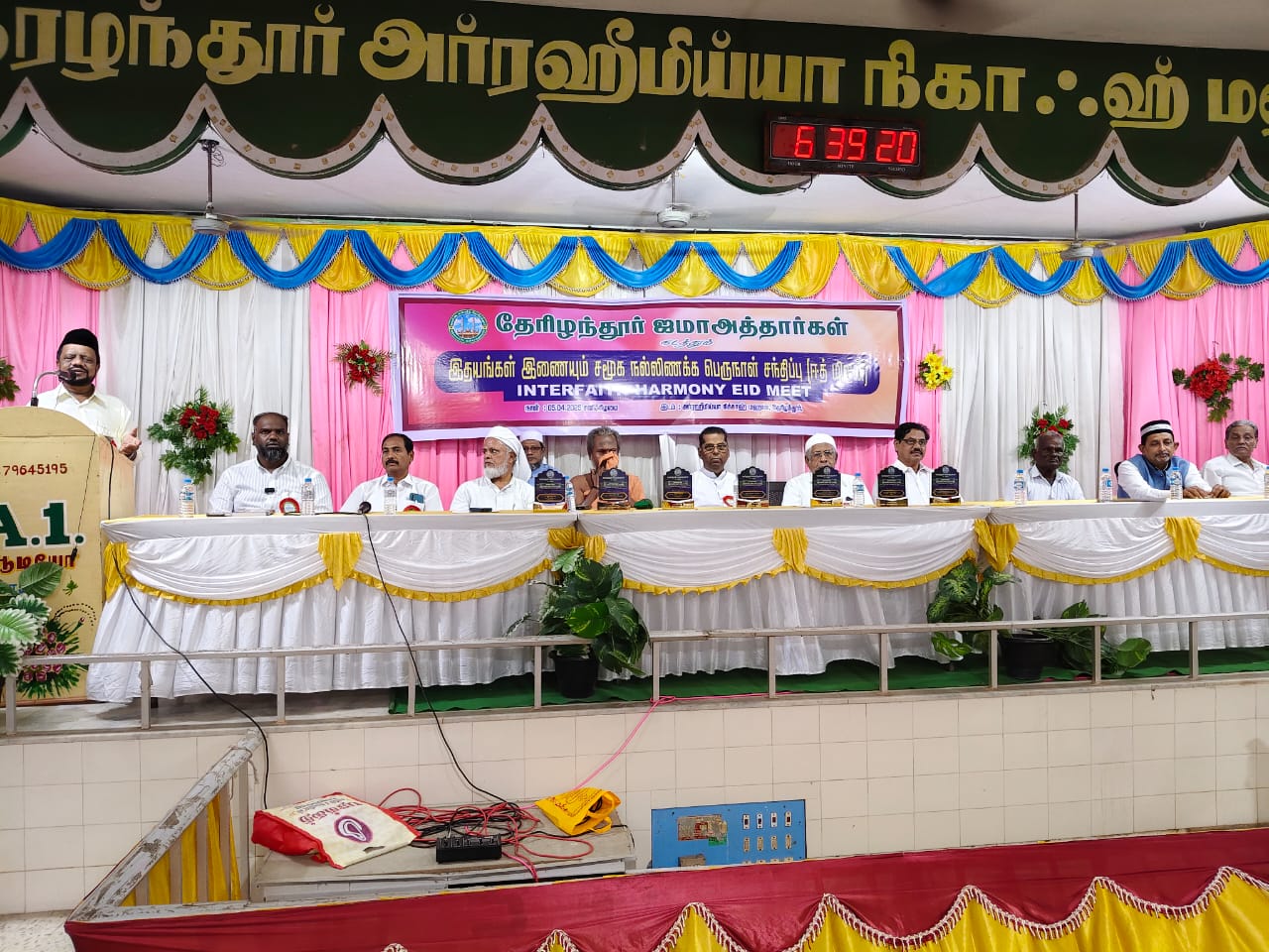 மயிலாடுதுறை மாவட்டம் மயிலாடுதுறை அடுத்த தேரிழந்தூர் கிராமத்தில் இஸ்லாமிய ஜமாத்தார்கள் சார்பில் இதயங்கள் இணையும் சமூக நல்லிணக்க பெருநாள் சந்திப்பு விழா நடைபெற்றது.