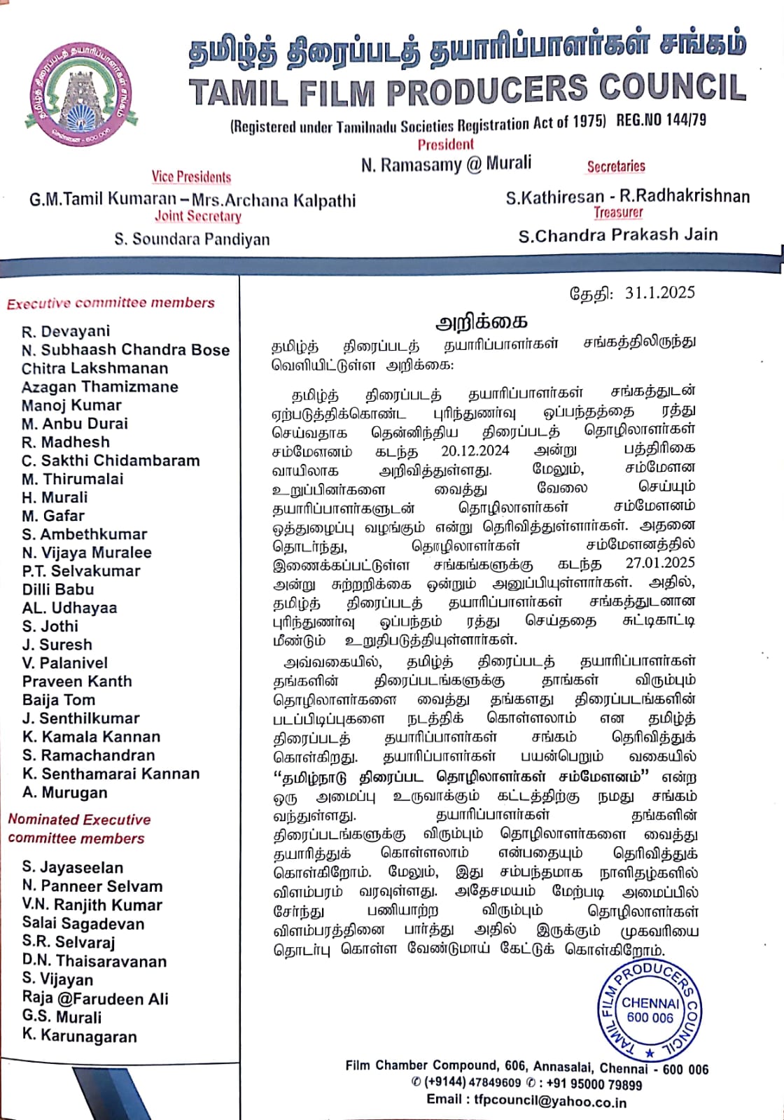 தமிழ் திரைப்பட தயாரிப்பாளர்கள் சங்கத்துடன் ஏற்படுத்திக்கொண்ட புரிந்துணர்வு ஒப்பந்தத்தை ரத்து செய்வதாக, தென்னிந்திய திரைப்பட தொழிலாளர்கள் சம்மேளனம் கடந்த 20.12.2024 அன்று பத்திரிகை வாயிலாக அறிவித்தது.
