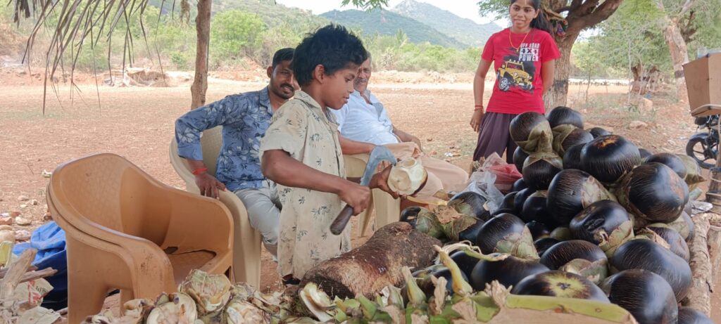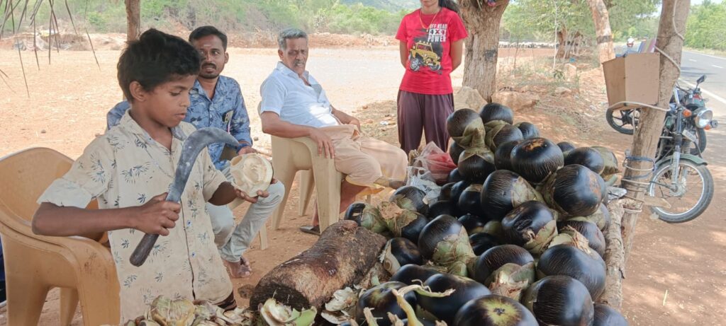 இந்நிலையில் தற்போது பள்ளி கோடை கால விடுமுறை என்பதால் சிவசங்கர் தனது பெற்றோர்களை தோட்டத்தில் விவசாய பணியை நீங்கள் பார்த்துக் கொள்ளுங்கள் என்று கூறிய அனுப்பிவிட்டு கடுமையான வெயிலுக்கு இதமான பனை நுங்குவை சிறுவன் சிவசங்கர் மின்னல் வேகத்தில் அரிவாளால் ஸ்டைலாக நுங்குவை வெட்டி எடுத்து சாலையில் செல்லும் வாகன ஓட்டிகளிடம் ஒரு நுங்கு ரூ 10 க்கு விற்பனை செய்து வருகிறார்.