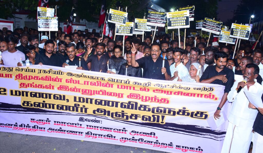 தொடர்ந்து மாணவ மாணவிகளின் உயிர் இழப்பை தடுக்க தவறிய திமுக அரசை கண்டித்து கரூர் தலைமை தபால் நிலையம்அருகே மாவட்ட மாணவரணி செயலாளர் வழக்கறிஞர் சரவணன் தலைமையில், முன்னாள் அமைச்சர் எம் ஆர் விஜயபாஸ்கர் உள்ளிட்ட அதிமுகவினர் ஏராளமானோர் கண்டன கோஷங்களை எழுப்பி 22 மாணவ மாணவிகளுக்கு மெழுகுவர்த்தி ஏத்தி கண்ணீர் அஞ்சலி செலுத்தினர்.