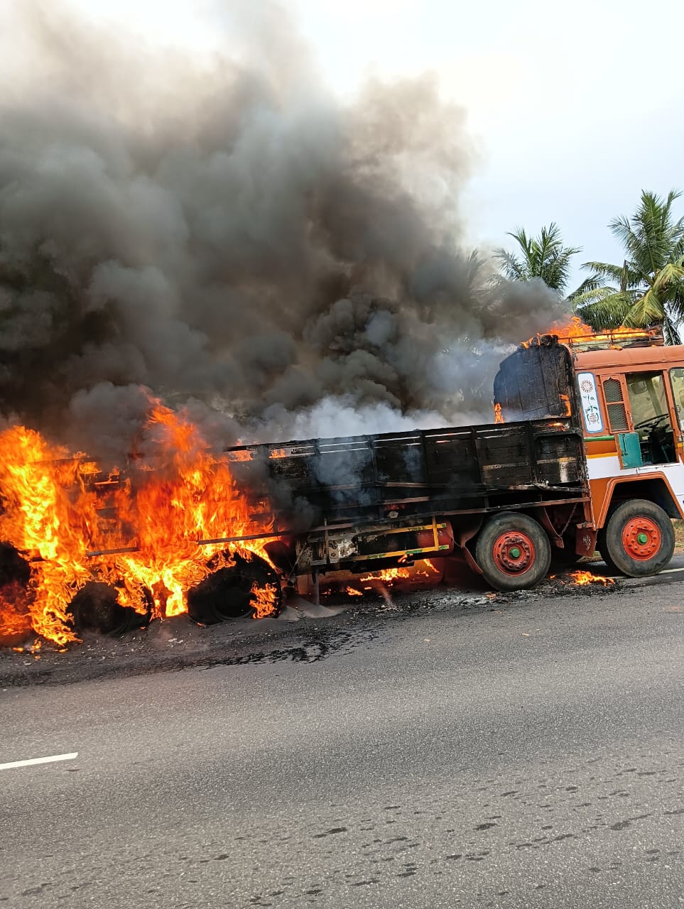நாகர்கோவிலில் இருந்து சேலத்திற்கு நேற்று இரவு சிமெண்ட் மணலை ஏற்றுக் கொண்டு லாரி புறப்பட்டது. அந்த லாரியை நாகர்கோவிலைச் சேர்ந்த மகேஸ்வரன் (வயது 55)என்பவர் ஓட்டிக் கொண்டு வந்தார். அந்த லாரி மதுரை- திண்டுக்கல் தேசிய நான்கு வழிச்சாலையில் வாடிப்பட்டி அருகே குலசேகரன் கோட்டை பிரிவு முன்பாக வந்த போது, திடீரென்று டயரில் தீப்பிடித்தது. அதை பார்த்த டிரைவர் மகேஸ்வரன் லாரியை ஓரமாக நிறுத்திவிட்டு இறங்கி தண்ணீர் ஊற்றி அணைக்க முயன்றார் . ஆனால் அதற்குள் கண்ணிமைக்கும் நேரத்தில் தீ மளமள என்று லாரி முழுவதும் எரிய தொடங்கியது. இதனைக் கண்டு அந்தப் பகுதியில் பேருந்துகளில் பயணம் செய்தவர்கள் பதட்டம் அடைந்தனர்.