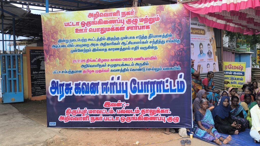 இடம் பெயர்ந்த 1008 குடும்பங்கள் பட்டா கேட்டு கடந்த 30 ஆண்டுகளாக போராடி வருகின்றனர்.அரசு தரப்பில் இருந்து எந்த பதிலும் கிடைக்காத நிலையில் நாளை திருப்பூர் வரும் தமிழக முதல்வரின் கவனத்தை ஈர்க்கும் வகையில் இன்று அறிவொளி நகர் பகுதியில் நூற்றுக்கும் மேற்பட்ட கடைகள் அடைக்கப்பட்டு, ஆயிரத்துக்கும் மேற்பட்டோர் அரசின் கவனத்தை ஈர்க்கும் வகையில் காத்திருப்பு போராட்டத்தில் ஈடுபட்டு வருகின்றனர்.
