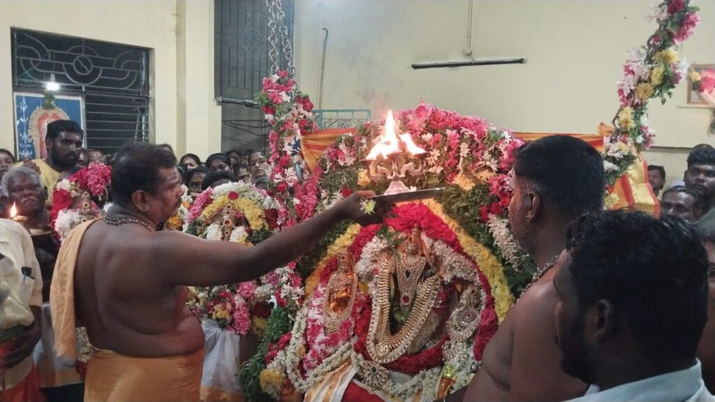 உற்சவர் முருகன் வள்ளி தெய்வானைக்கு 16 வகை வாசனை திரவியங்கள் அபிஷேகம் செய்யப்பட்ட இந்த மலர்களால் அலங்கரிக்கப்பட்டது.