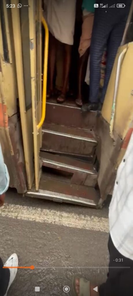 அரசுப் பேருந்தின் பின்பக்க படிக்கட்டு உடைந்து விபத்து..,