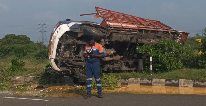 இந்த விபத்தில் டிரைவர் சுதாகர் லேசான காயங்களுடன் உயிர் தப்பினார்.‌