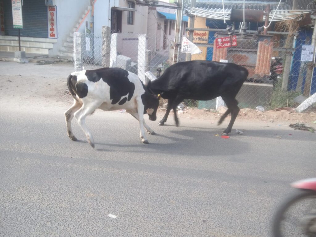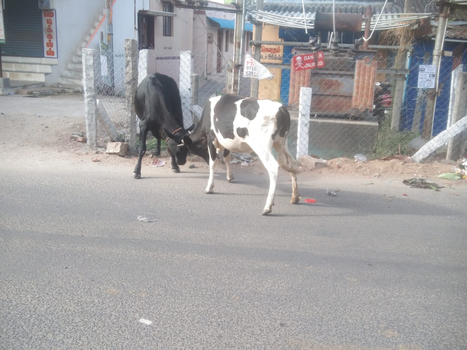 ரோட்டில் சுற்றித் திரியும் மாடுகள் குப்பை கழிவுகளில் உணவு இருக்கிறதா என ஒன்றுக்கு ஒன்று சாப்பிடுவதில் கால்நடைகளுக்குள் சண்டை ஏற்படுகிறது. மெயின் ரோட்டில் சண்டையிட்டுக் கொள்வதால் கால்நடைகளை கடந்து செல்ல முடியாமல் வாகன ஒட்டிகளும், நடந்து செல்பவர்களும் அச்சப்பட வேண்டிய நிலை உள்ளது. ஆகையால் சம்பந்தப்பட்ட அதிகாரிகள் ரோட்டில் தானாக திரியும் கால்நடைகளை அப்புறப்படுத்தவும் கால்நடை வளர்ப்பவர்கள் மீது உரிய நடவடிக்கை எடுக்க வேண்டும் என கோரிக்கை விடப்பட்டுள்ளது.