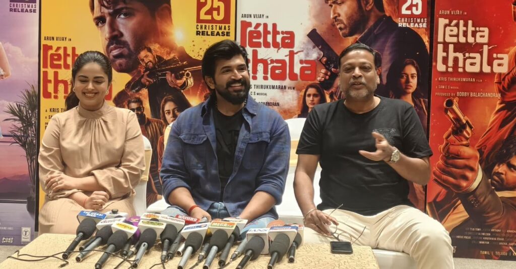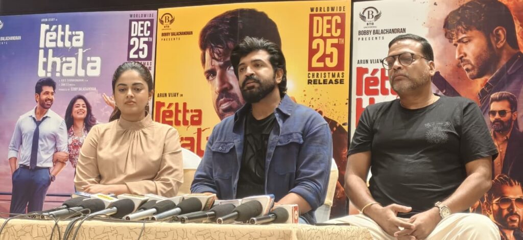 ‘ரெட்ட தல’ திரைப்படத்தின் செய்தியாளர் சந்திப்பு கோவை அவிநாசி சாலையில் உள்ள தனியார் நட்சத்திர விடுதியில் நடைபெற்றது.இந்த படத்தில் அருண் விஜய், சித்தி இத்னானி, தன்யா ரவிச்சந்திரன், ஹரீஷ் பெரடி, யோகேஷ் சாமி, ஜான் விஜய் உள்ளிட்டோர் நடித்துள்ளனர். கிரிஷ் திருக்குமரன் இயக்கத்தில், சாம்.சி.எஸ் இசையமைத்துள்ள இந்த படத்தை பிடிஜி யூனிவர்சல் சார்பில் பாபி பாலச்சந்திரன் தயாரித்துள்ளார்.டிசம்பர் 25ஆம் தேதி ‘ரெட்ட தல’ திரைப்படம் திரையரங்குகளில் வெளியாகிறது.
