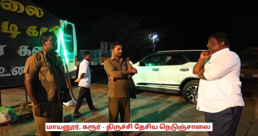 கோவை மாவட்டத்திலிருந்து தனது சொந்த ஊரான அரியலூர் மாவட்டத்திற்கு தமிழக போக்குவரத்து துறை அமைச்சர் மற்றும் மின்சாரத் துறை அமைச்சருமான சிவசங்கர் சென்று கொண்டிருந்தபோது கரூர் – திருச்சி தேசிய நெடுஞ்சாலையில் மாயனூர் சுங்கச்சாவடி அருகில் அரசு பேருந்து அரசு போக்குவரத்து கழகங்களின் சார்பில் தங்களுக்கு ஒதுக்கப்பட்ட ஹோட்டல்களில் நிறுத்தாமல் ஓட்டுநர்கள் மற்றும் நடத்துனர்கள் அவர்களுக்கு விருப்பத்திற்கு ஏற்ப நிறுத்திய ஓட்டுநர் மற்றும் நடத்தினர்களிடம் அறிவுரை வழங்கினார்.