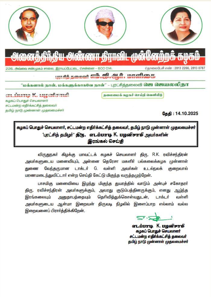 விருதுநகர் அதிமுக கிழக்கு மாவட்ட செயலாளர் ரவிச்சந்திரன் அவர்களது மனைவி கொடைக்கானல் அன்னை தெரசா பல்கலைக்கழக முன்னாள் துணைவேந்தர் டாக்டர் வள்ளி அவர்கள் உடல் நலக்குறைவினால் காலமானார்.