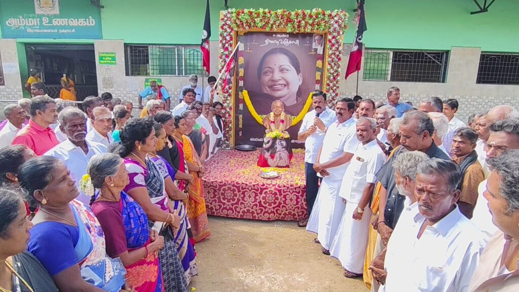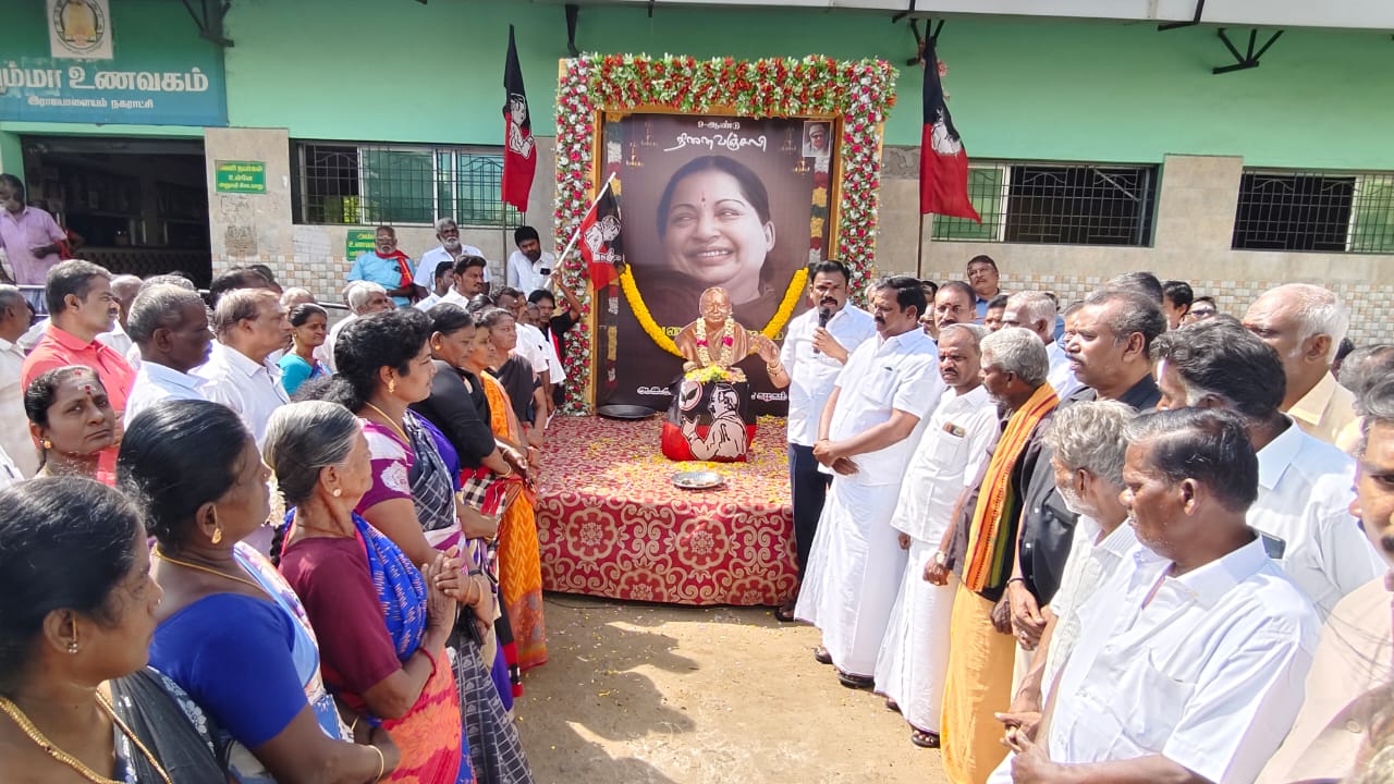 விருதுநகர் மாவட்டம் இராஜபாளையம் அம்மா உணவகம் அருகே இராஜபாளையம் தெற்கு நகர கழகம் சார்பில் மறைந்த முன்னாள் முதல்வர் அதிமுக ஜெயலலிதாவின் ஒன்பதாவது ஆண்டு நினைவு நாளை அனுசரிக்கும் விதமாக அலங்கரிக்கப்பட்டது ஜெயலலிதா உருவப்படத்திற்கு மலர் தூவி கற்பூரம் காட்டி அஞ்சலி செலுத்தப்பட்டது