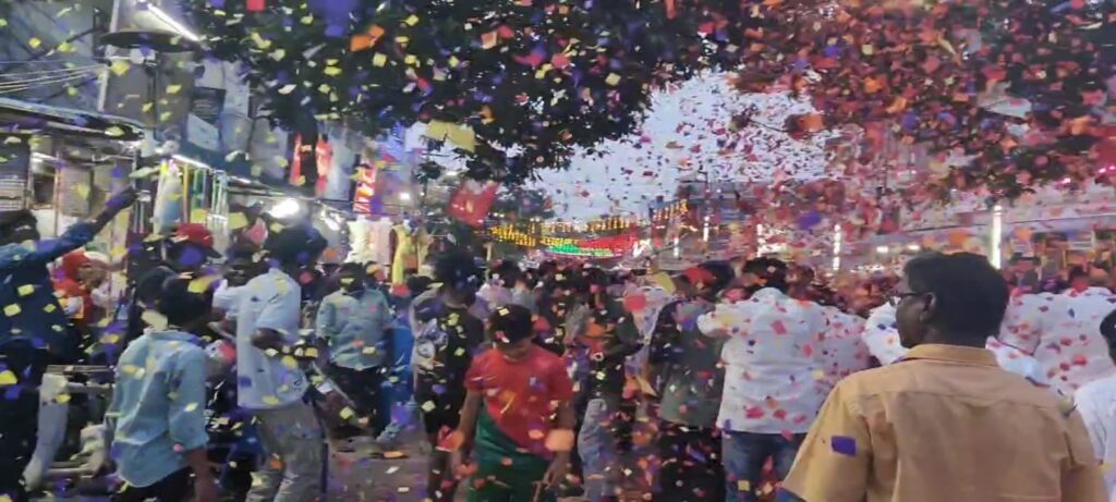 அது மட்டும் இல்லாமல் ஆடம்பரம் விளம்பரத்துக்காக வட்ட செயலாளர் அப்பு என்கிற நாகராஜ் என்பவர் திடீரென இயந்திரத்தை வைத்து கலர் காகிதங்களை சாலையில் பறக்க விட்டதால் வாகன ஓட்டிகள் மீது விழுந்தது. இதனால் வாகன ஓட்டிகள் வாகனத்தை இயக்க முடியாமல் கடும் அவதிப்பட்டனர்.