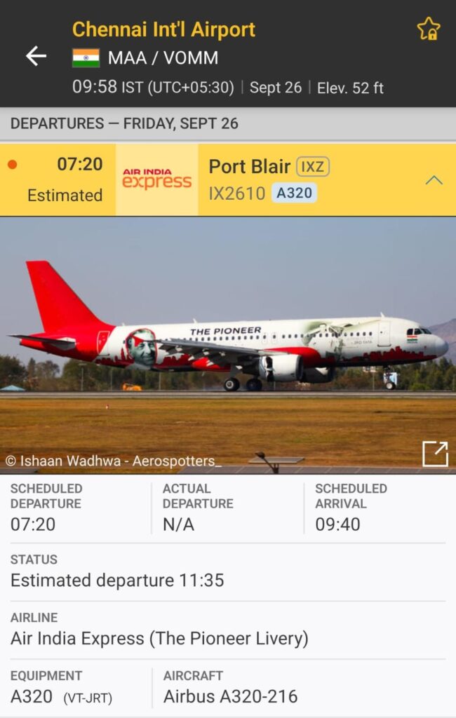 சென்னையில் இருந்து அந்தமானுக்கு இன்று காலை 7:20 மணிக்கு, ஏர் இந்தியா எக்ஸ்பிரஸ் பயணிகள் விமானம் புறப்பட்டுச் செல்ல வேண்டும். அந்த விமானத்தில் இன்று சென்னையில் இருந்து அந்தமான் செல்வதற்காக 158 பயணிகள் இருக்கின்றனர்.