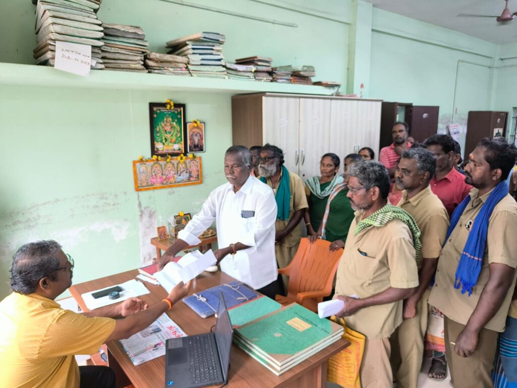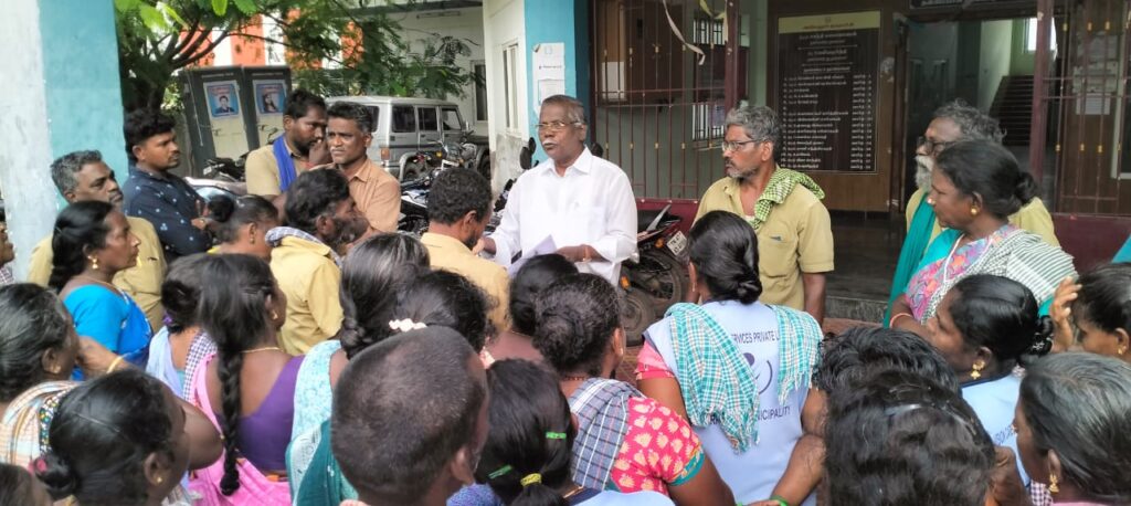 துப்புரவு தொழிலாளர் குடியிருக்கும் தெற்கு பெரிய தெரு காலனி பகுதியில் சுற்றி ஆக்கிரமிப்புப்பட்டு பாதை வழி இல்லாமல் அவதிப்படும் நிலையை போக்கிட உடனடியாக சர்வே செய்து ஆக்கிரப்புகளை அகற்றி பாதை வசதி செய்வதோடு அக்காலியிடத்தில் துப்புரவு பணியாளர்களுக்கு குடியிருப்பு வசதி கட்டிக் கொடுக்கப்பட வேண்டும். மேற்கண்டவாறு பல்வேறு கோரிக்கைகள் அடங்கிய மகஜரை 17.12.2025 இன்று அளவில் நிரந்தர மற்றும் ஒப்பந்த தூய்மை பணியாளர்கள் பழைய நகராட்சி அலுவலகத்தில் இருந்து திரளாக சென்று புதிய நகராட்சி அலுவலகத்தில் நகராட்சி ஆணையர் இல்லாததால் மேனேஜரிடம் – ஏ ஐ டி யூசி உள்ளாட்சி சம்மேளன மாநிலச் செயலாளர் டி தண்டபாணி, கோரிக்கை மனுவை அளித்து விளக்கிப் பேசினார்.