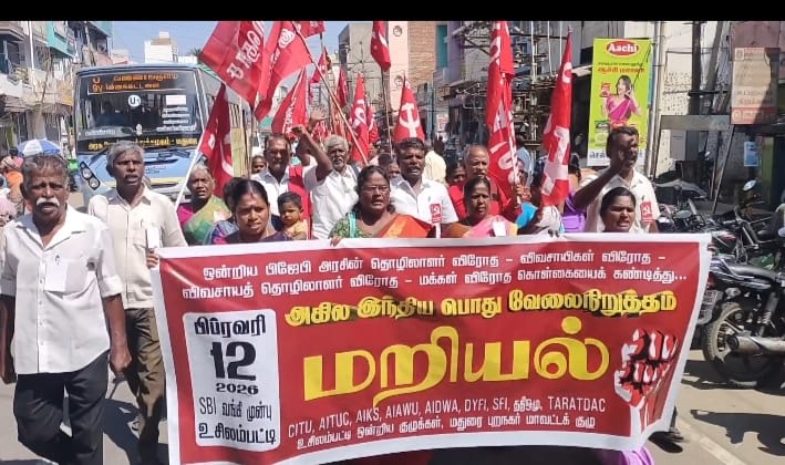 இதன் ஒரு பகுதியாக மதுரை மாவட்டம் உசிலம்பட்டியில் மத்திய தொழிற்சங்கங்கள் மற்றும் ஐக்கிய விவசாயிகள் முன்னணி சார்பில் உசிலம்பட்டி முருகன் கோவிலிலிருந்து பேரையூர் ரோடு வரை ஊர்வலமாக சென்று பாரத ஸ்டேட் வங்கி முன்பு மறியல் மற்றும் முற்றுகை போராட்டத்தில் ஈடுபட்டனர்.,