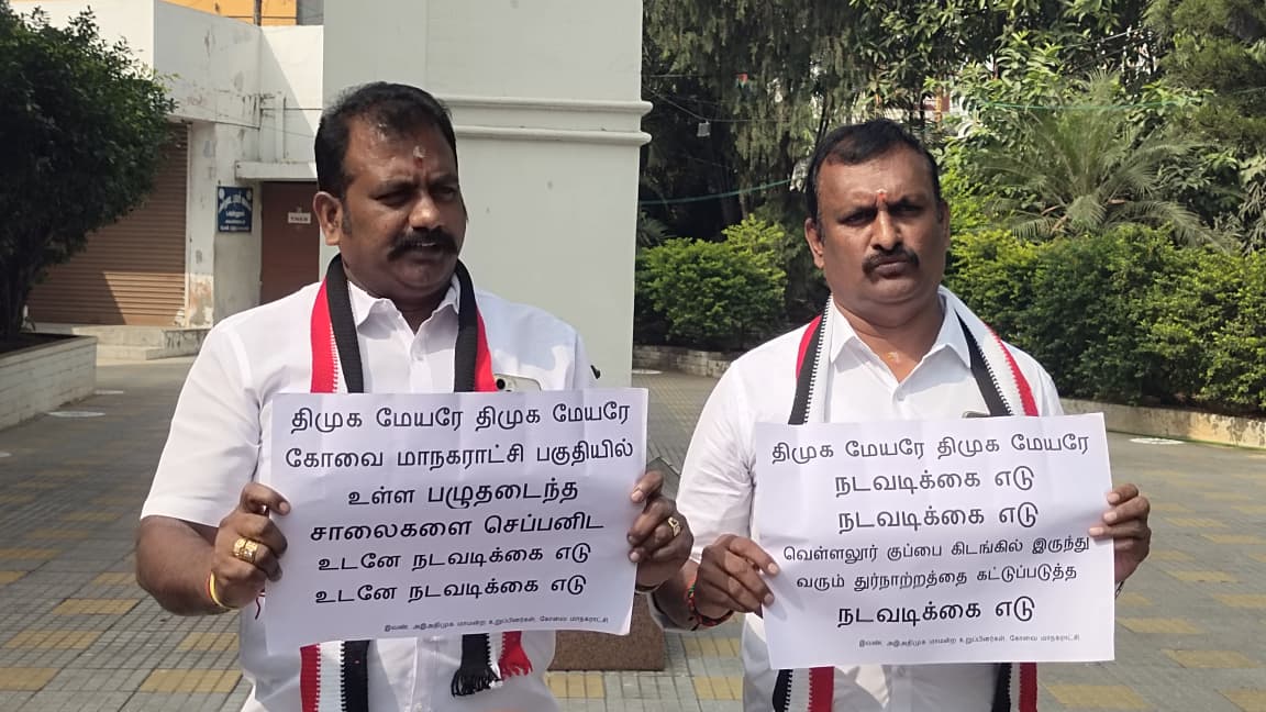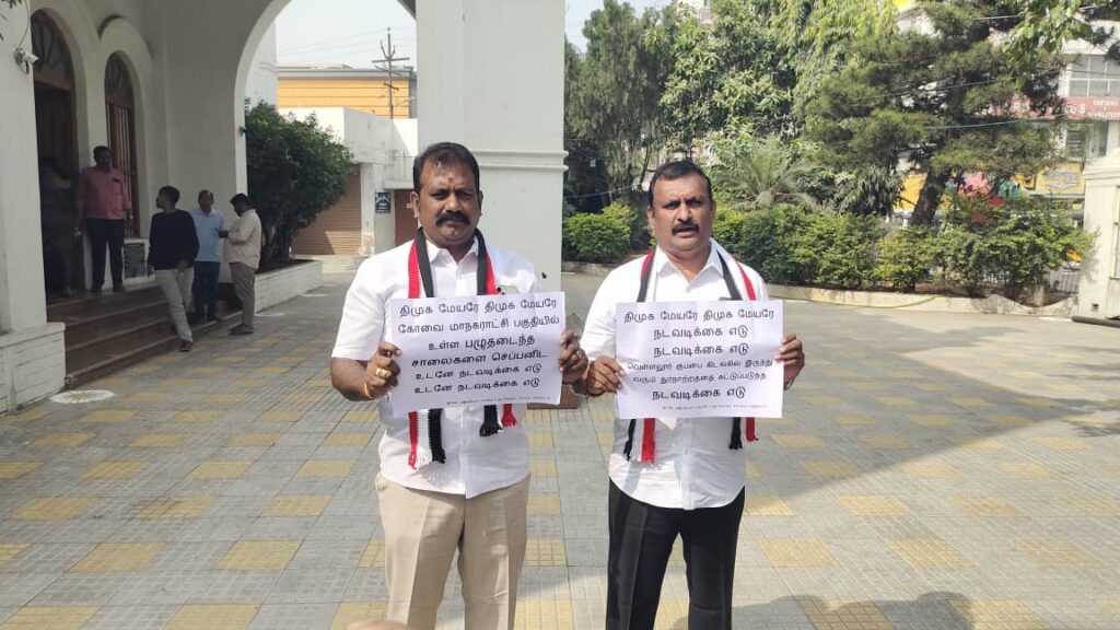 இதில் 150 தீர்மானங்கள் கொண்டு வரப்பட்டது. இந்த நிலையில் மாமன்ற கூட்டத்திற்கு வந்த அ.தி.மு.க கவுன்சிலர்கள் பிரபாகரன் ரமேஷ் ஆகியோர் அங்கு திடீர் தர்ணாவில் ஈடுபட்டனர்.