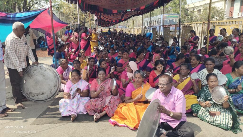பல்வேறு கோரிக்கைகளை வலியுறுத்தி சத்துணவு அங்கன்வாடி ஊழியர்கள் தொடர் போராட்டத்தில் ஈடுபட்டு வரும் நிலையில் 15வது நாளான இன்று காலி தட்டுகளையும் டிபன் பாக்ஸ்களை தட்டி போராட்டத்தை நடத்தி வருகின்றனர். கோவையில் தெற்கு வட்டாட்சியர் அலுவலகம் அருகில் நாள்தோறும் இரவு முழுவதும் அங்கேயே படுத்து உறங்கி போராட்டத்தை தொடர்ந்து நடத்தி வருகின்றனர்.