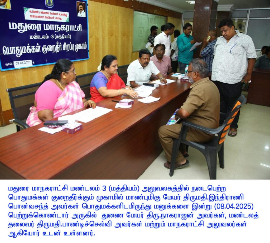 மதுரை மாநகராட்சி மண்டலம் 3 (மத்தியம்) அலுவலகத்தில் பொதுமக்கள் குறைதீர்க்கும் முகாம், மேயர் இந்திராணி பொன்வசந்த் தலைமையில் நடைபெற்றது.