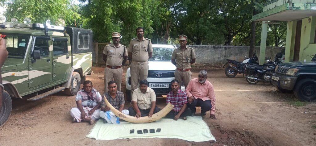 அப்போது, யானை தந்தத்தை விற்பனை செய்ய முயன்ற இடைத்தரகர்கள் ரகுநாத், சுப்பிரமணி, ரமேஷ் மணிகண்டன் மற்றும் சுதாகர் ஆகியோரை வனத்துறையினர் கைது செய்தனர். மேலும் விற்பனைக்காக கொண்டுவரப்பட்ட யானை தந்தத்தையும் பறிமுதல் செய்தனர்.
