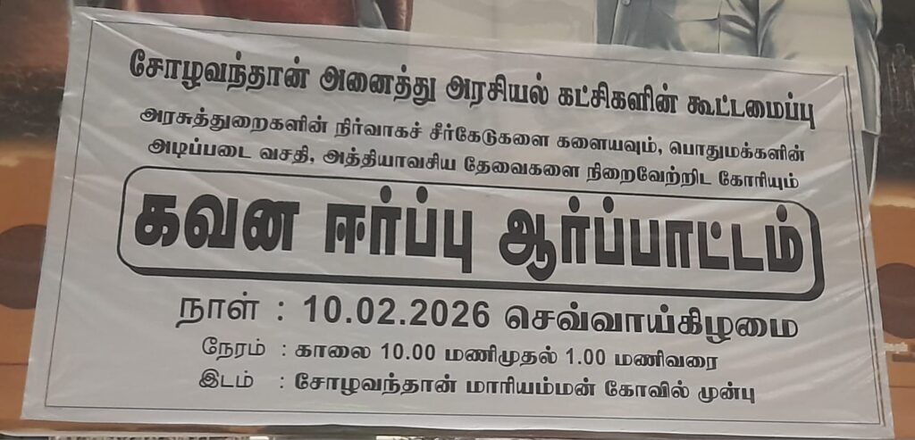 இது குறித்து பலமுறை மக்கள் பிரதிநிதிகள் மற்றும் அரசு அதிகாரிகளின் கவனத்திற்கும் சம்பந்தப்பட்ட துறை அதிகாரிகளின் கவனத்திற்கும் சமூக ஆர்வலர்கள் மற்றும் பொதுமக்கள் மனுக்களாகவும் கோரிக்கைகளாகவும் கொண்டு சென்ற நிலையில் தற்போது வரை தீர்க்கப்படவில்லை என கூறப்படுகிறது. இந்த நிலையில் அரசின் கவனத்தை ஈர்க்கும் வகையில் கவன ஈர்ப்பு ஆர்ப்பாட்டம் நடத்த முடிவு செய்துள்ளனர். இதன்படி நாளை அதாவது 10.2.2026 செவ்வாய்க்கிழமை காலை 10 மணி அளவில் சோழவந்தான் ஜெனகை மாரியம்மன் கோவில் முன்பு அரசின் கவனத்தை ஈர்க்கும் வகையில் அனைத்து அரசியல் கட்சிகள் மற்றும் சமுதாய அமைப்புகள் தொண்டு நிறுவனங்கள் சமூக ஆர்வலர்கள் பொதுமக்கள் ஆகியோர் ஒன்றாக இணைந்து கவன ஈர்ப்பு ஆர்ப்பாட்டத்தில் ஈடுபட உள்ளனர்.