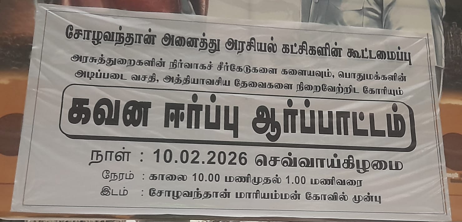 இந்த நிலையில் அரசு நிர்வாகங்களை கண்டித்து சோழவந்தான் அனைத்து அரசியல் கட்சிகளின் கூட்டமைப்பு சார்பாக கவன ஈர்ப்பு ஆர்ப்பாட்டம் 10 2 2026 செவ்வாய்க்கிழமை காலை 10 மணி அளவில் சோழவந்தான் ஜெனகை மாரியம்மன் கோவில் முன்பாக நடைபெறுகிறது குறிப்பாக அதலபாதாலத்திற்கு சென்றுள்ள சோழவந்தான் பேரூராட்சி நிர்வாகம் மற்றும் அரசு போக்குவரத்து கழகம் உள்பட அரசின் பல்வேறு துறைகளில் பொது மக்களின் எந்த ஒரு கோரிக்கைகள் மற்றும் பிரச்சனைகள் தீர்க்கப்படவில்லை என பொதுமக்கள் மத்தியில் பரவலாக குற்றச்சாட்டு எழுப்பப்பட்டு வந்தது.