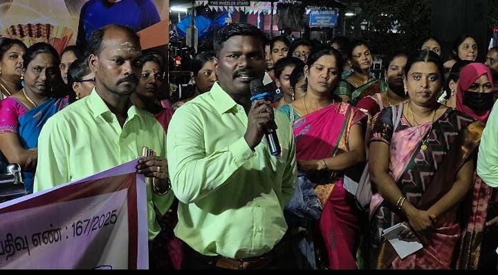 அனைத்து நிலை ஆசிரியர்கள் கூட்டமைப்பு தலைவர் ஜெரோம் ஆரோக்கியராஜ் தலைமையில் காரைக்கால் புதிய பேருந்து நிலையம் அருகே நடைபெற்ற ஆர்ப்பாட்டத்தில் ஆசிரியர்களை உடனே பணி நிரந்தரம் செய்ய வேண்டும்.