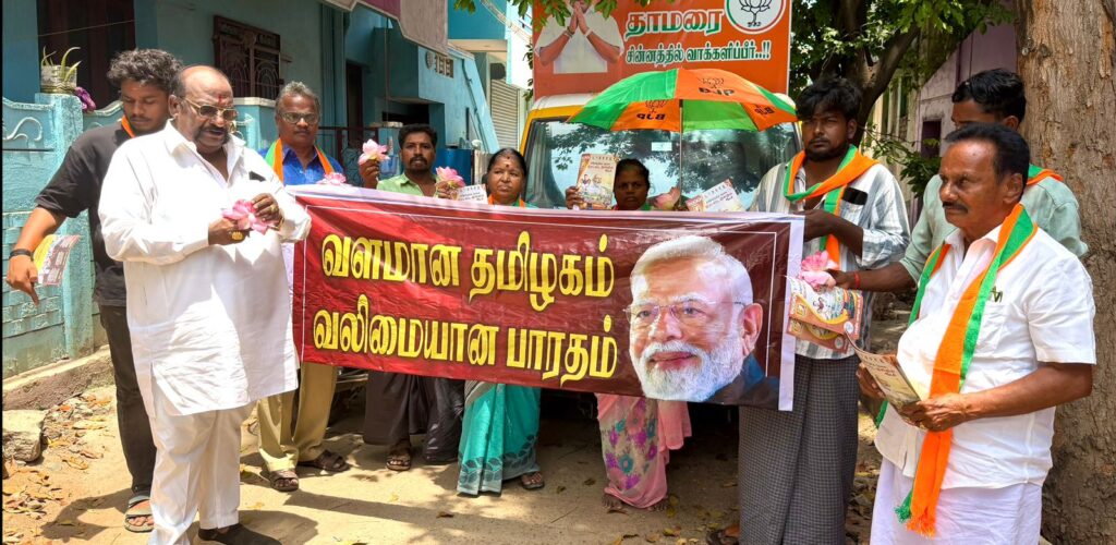 வலிமையான பாரதம்”என்கிற பதாதகையை ஏந்தியபடி மோடிஜி அரசின் சாதனை விளக்கப் பிரசுரங்களையும் தாமரை மலர்களையும் வீடுவீடாக வழங்கி